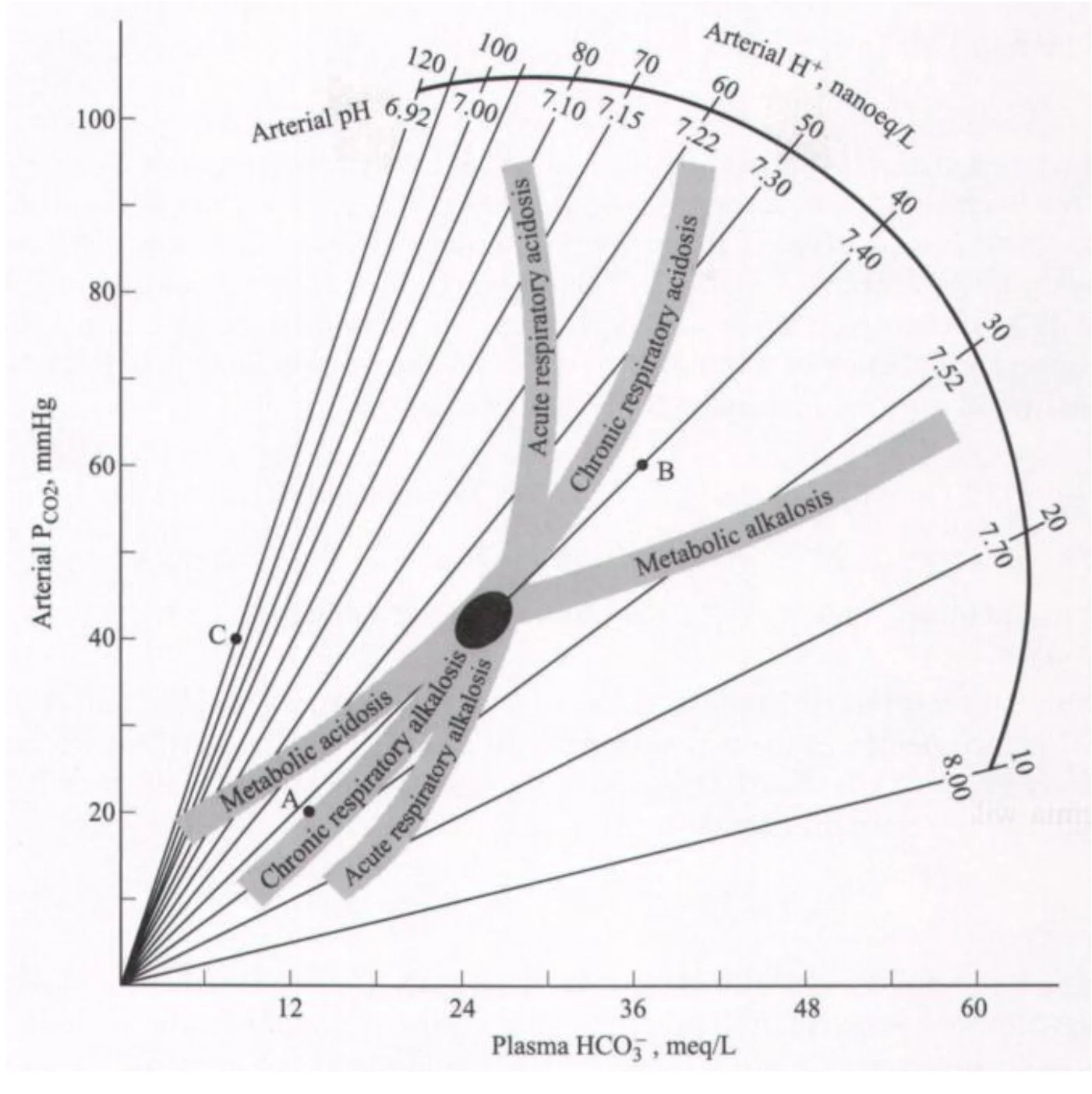 A nomogram for the interpretation of acid-base data is figure 17-1 in the book, this manuscript with the ! in the conclusion creates the acid-base map.